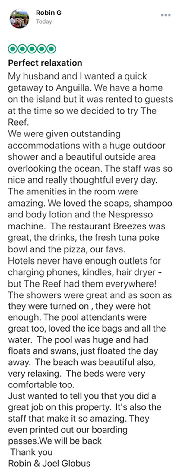 Glowing Review of The ReefMany thanks to Robin Globus who sent in a glowing review on the five-star Anguilla resort, The Reef!