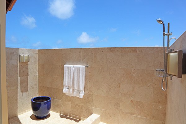 Oversized and open to the sky, this is one of the most luxurious outdoors showers we have seen. Peep over the edge and Savannah Bay meets your eye in the distance. Back on the main floor lie three additional master suites. Each is large, well appointed and complete with private ensuite