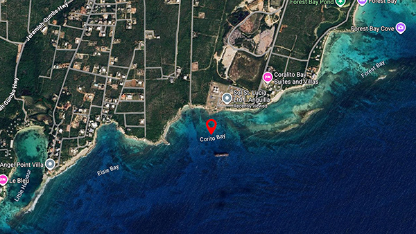 The red pin (below) is Corito Bay. Zoom in on the Anguilla map for more detail.